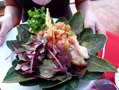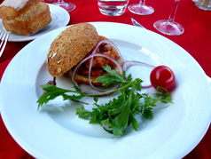 こちらの前菜は、エクセランスの"サーモンのタルタルと香草バーガー"。