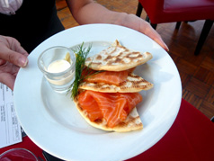 前菜"スモークサーモンのミルフィーユ"。こちらのサーモンも新鮮!