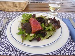 前菜は、ロックフォールチーズを軽く焼いた生ハムで巻いたサラダ!