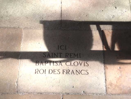 "ここで、聖レミによって、フランク王国の王クローヴィスの洗礼が行われた"