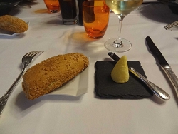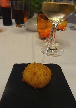 とりあえず、ランチメニューから選んで注文すると、アミューズで、フレッシュチーズのコロッケが出てきました。