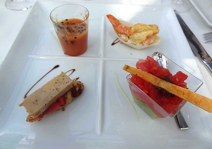 手前左=フォアグラ、手前右=トマトとオリーヴのワカモレ、
