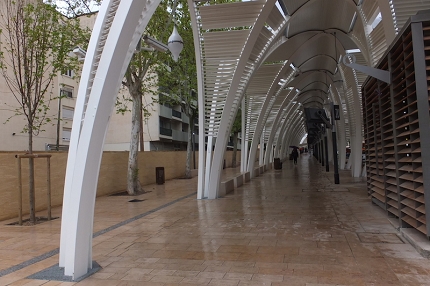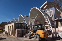 このなが〜いトンネルっぽい建物は、雨が避けられそうな部分は、天井部分のみ。。。斜めになっているサイド部分は、光を取り入れるために段差の間はあいた状態。なので、降った雨のしずくがポタリ。。。