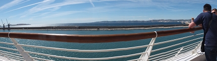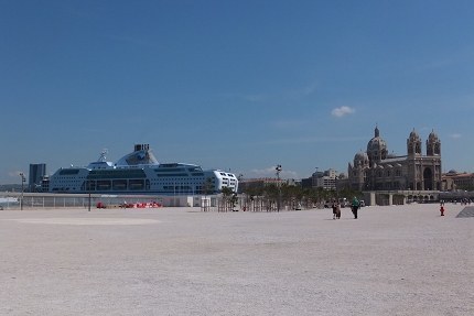 MuCEM 前広場からの眺め。フェリーが停泊している後方がショッピングモール。右側はマジョール大聖堂(建造1896年)