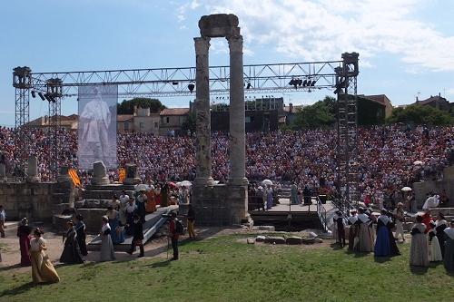 さて、ローマ帝国期の古代劇場跡での野外会場は、階段席が埋め尽くされた状態。