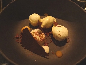 ラストのデザートは、 BANANE FRAICHE ET MASCARPONE, SABLE COQUANT, CRUMBLE CHOCOLAT ET COULIS DE FRUIT DE LA PASSION・・・