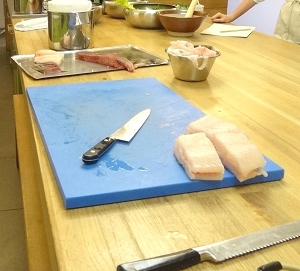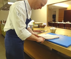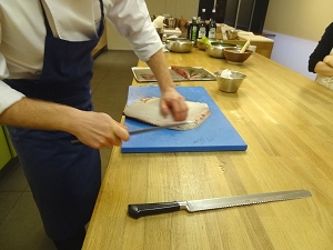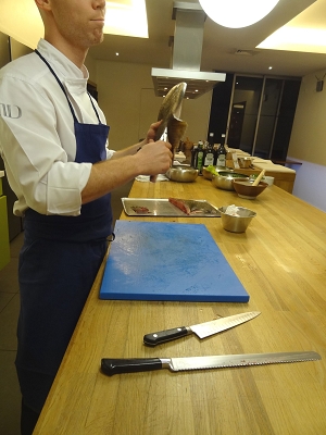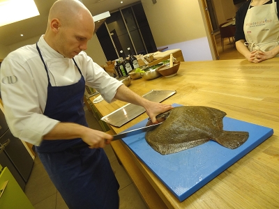 バスチアン先生シェフ、日本好き!とあって、自前の包丁など調理器具は「かっぱ橋で買った!」とのこと(笑)。 やはり日本の包丁類は、魚料理には欠かせないそうです!