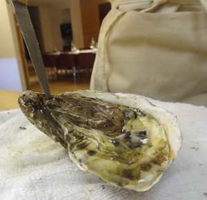 牡蠣用ナイフと布巾を用意して、平らな方を上にし、右利きの人は、右側にちょうつがいがくるように持ち、そこにナイフをグイッと入れ込みます。
