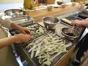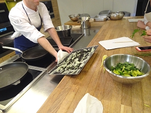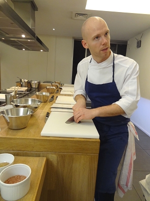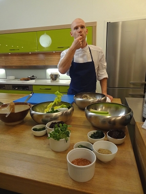 バスチアン先生、海藻やハーブを細かく切る包丁の動きを説明してくれました・・・ 手元を、見ていません(笑)! さすがシェフです。
