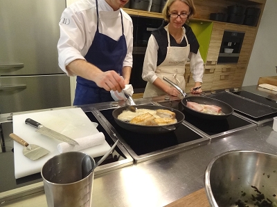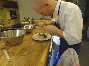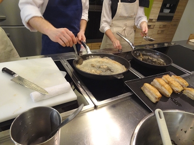 先生シェフが、とっても親切で分かりやすく説明してくれて、キッチンも広々キレイで、アラン・デュカスの学校自体が“3つ星”という感じでした。そして、間近で、本物のフレンチシェフの手際の良さ・技を見れて、感激しました!