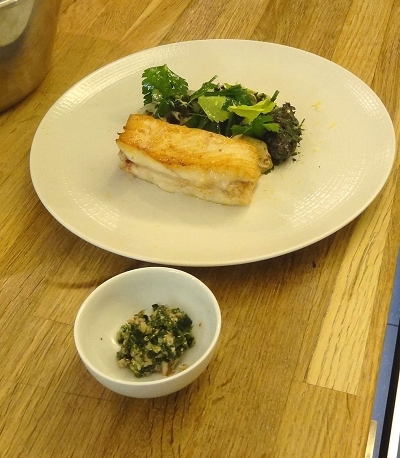 付合せの“セロリと海藻”を、“ハーブサラダ”の下にひき、“海藻のみじん切りとレモン汁”を混ぜたものを、スプーンで型どり、お皿の上から料理全体に、レモンの皮をすりおろします。