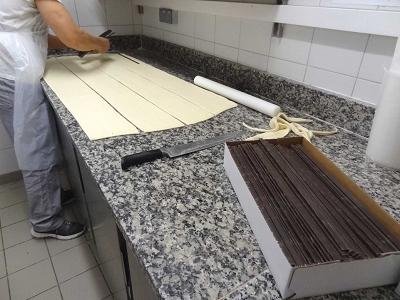 生地を伸ばして、切って、重ねて、、、さらに三角に切って・・・