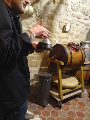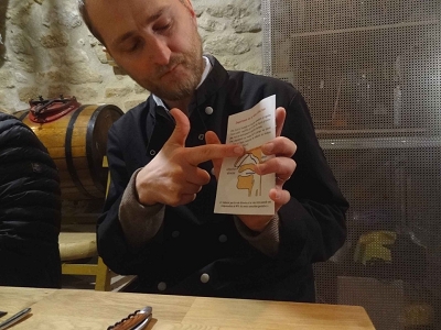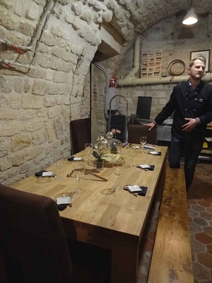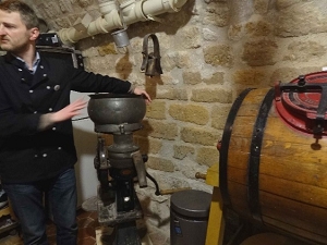 秘密基地に来たようなワクワク感を味わえる古いカーヴで、説明してくれるのは、ピエールさん!